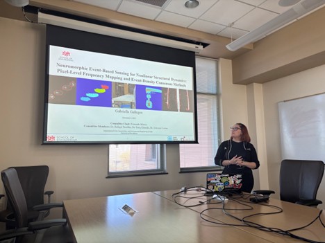 Congratulations Gabriela for a great MS defense / thesis entitled “Neuromorphic Event-based Sensing for non-linear structural dynamics: pixel-level frequency mapping and event-density consensus methods”. Committee Members Dr. Fowler (Sandia National Laboratory), Dr. Rafi Tarefdel (computational mechanics) and Dr. Tariq Kraishi (mechanical engineering)